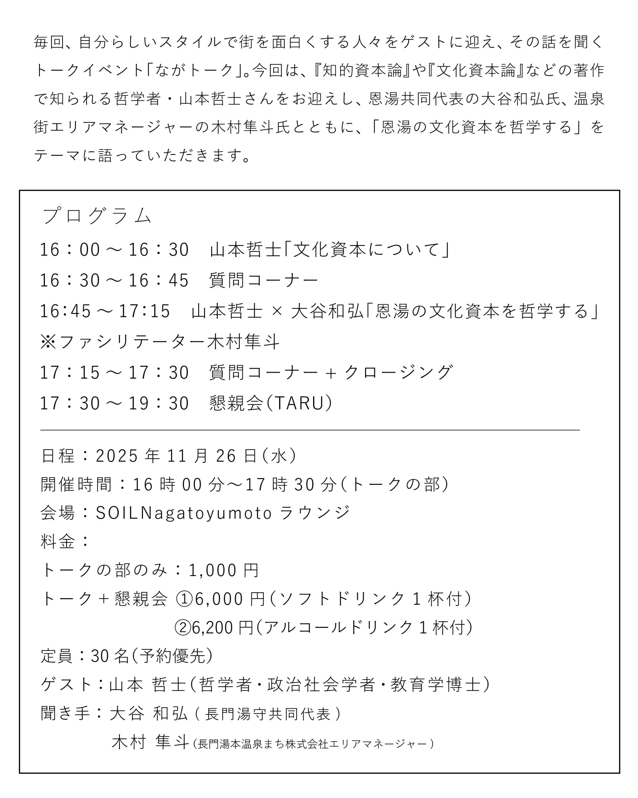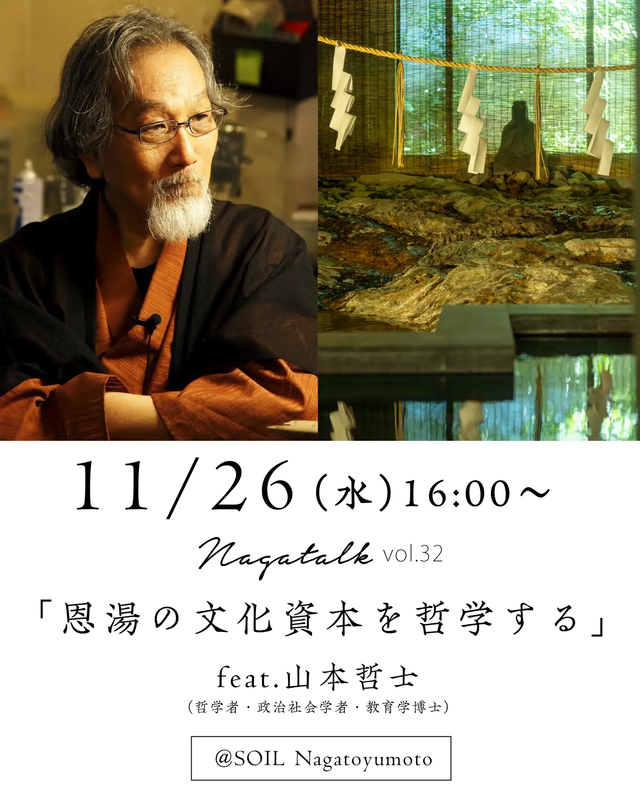 毎回、自分らしいスタイルで街を面白くする人々をゲストに迎え、その話を聞くトークイベント「ながトーク」。今回は、『知的資本論』や『文化資本論』などの著作で知られる哲学者・山本哲士さんをお迎えし、恩湯共同代表の大谷和弘氏、温泉街エリアマネージャーの木村隼斗氏とともに、「恩湯の文化資本を哲学する」をテーマに語っていただきます。