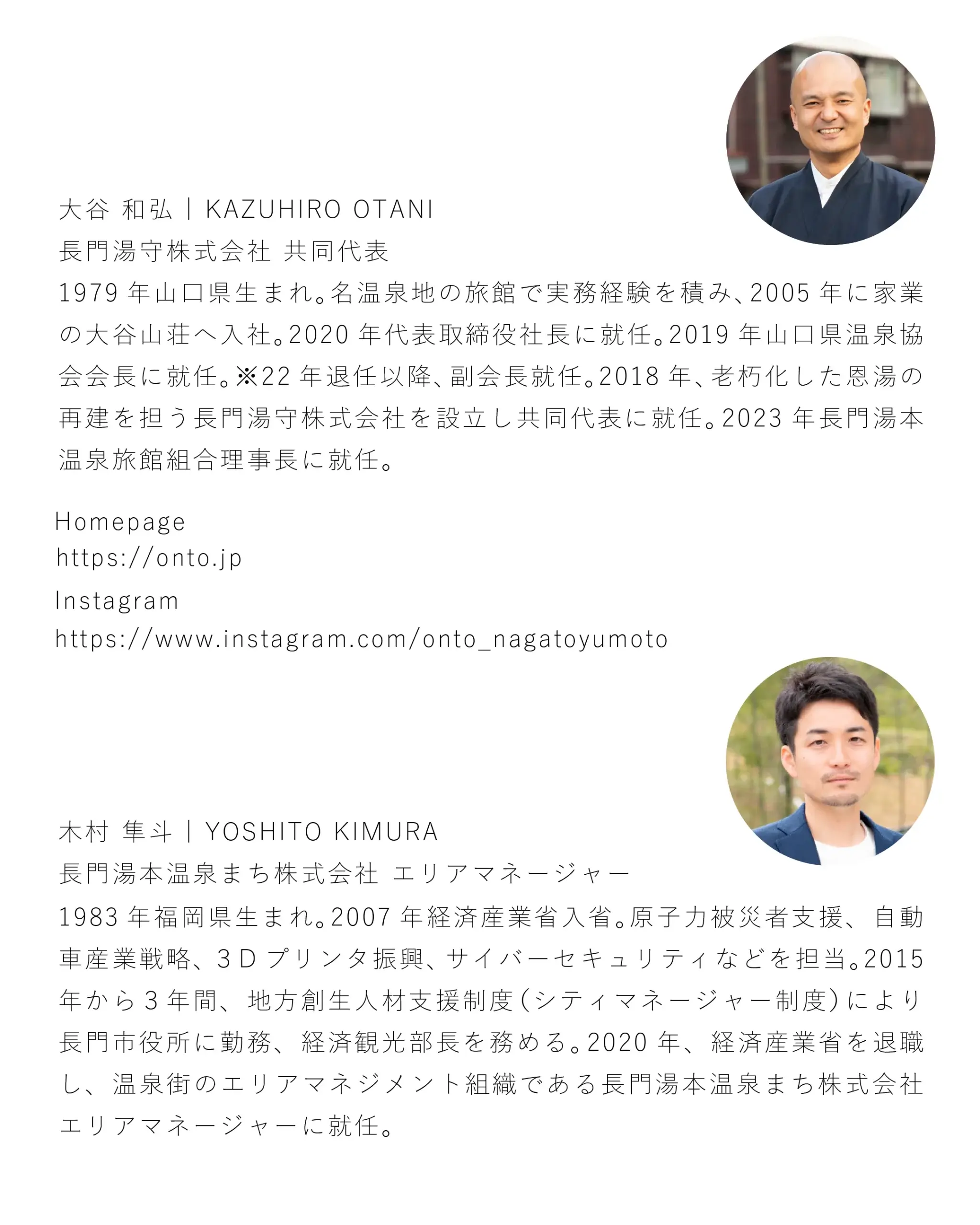 長門湯守株式会社 共同代表 1979年山口県生まれ。名温泉地の旅館で実務経験を積み、2005年に家業の大谷山荘へ入社。2020年代表取締役社長に就任。2019年山口県温泉協会会長に就任。※22年退任以降、副会長就任。2018年、老朽化した恩湯の再建を担う長門湯守株式会社を設立し共同代表に就任。2023年長門湯本温泉旅館組合理事長に就任。