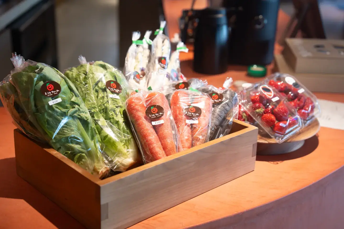 蒲田商店は、長谷園のかまどさんで炊く土鍋ごはん。9時に着火、9時40分ごろの炊きあがりを待つ時間も「朝ゆ市」の楽しみ方です。cafe&pottery音は「いちごモーニング」、苺とマスカルポーネのパニーノに苺ミルクを添えて。365+1 BEERは朝ビールに合う「しょっぱいモーニング」、ローズマリーをのせた中華風フォカッチャ。まちの番台は日置の発酵グラノーラ6種と日置グラバー3種、それに山口県酪の瓶牛乳。SOIL Nagatoyumotoは、ミノルファームの紅にんじんや黒にんじん、ロメインレタス、ホワイトアスパラガス、そして櫻谷農園のいちごを店頭に並べました。