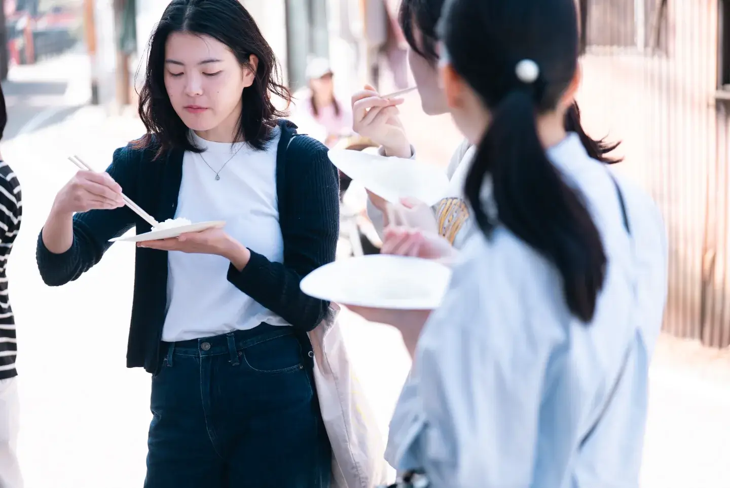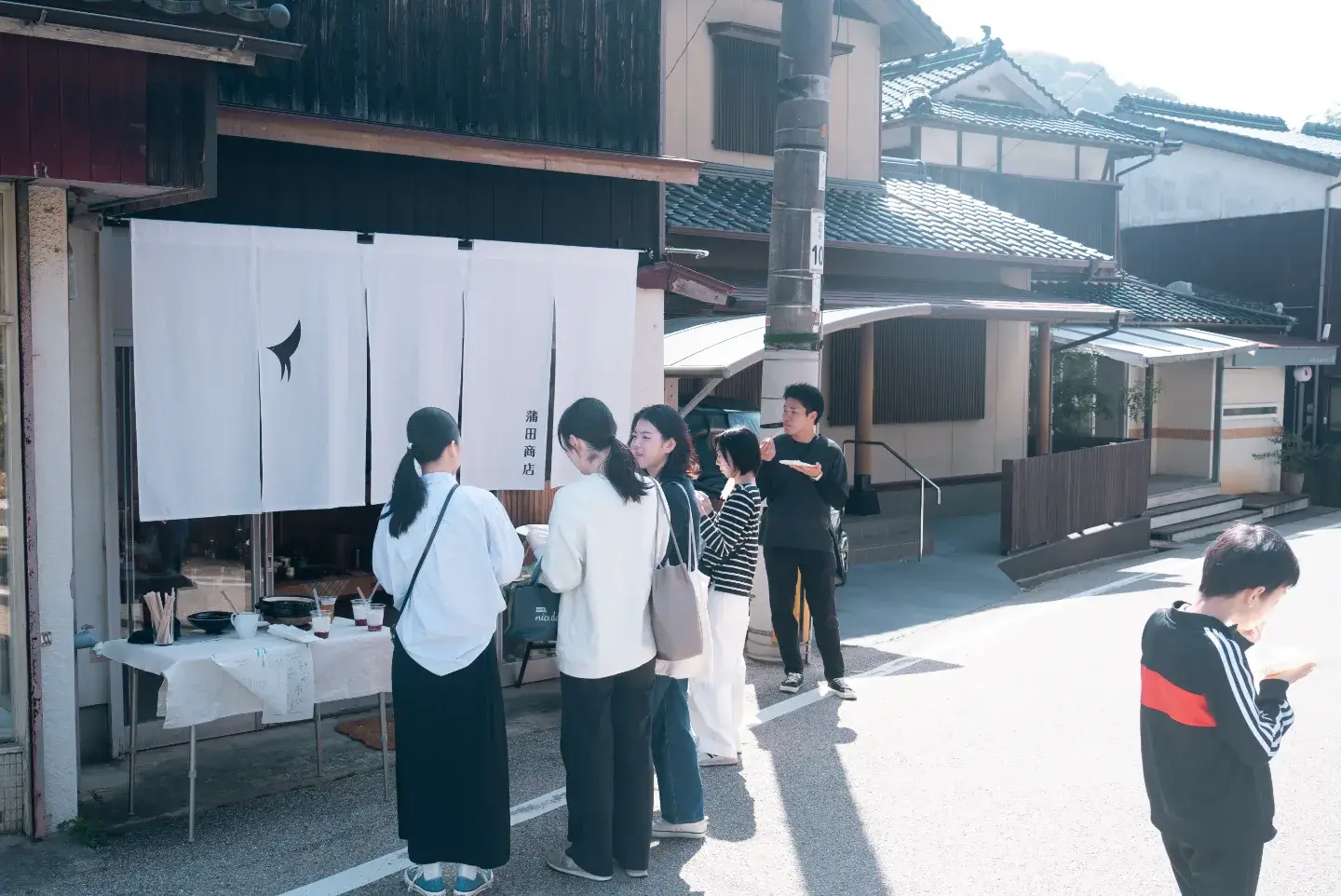 蒲田商店の店先では、かまどさんの蓋を開ける瞬間に歓声が上がりました。立ち上がる真っ白な湯気に、自然と笑顔がこぼれる人たち。紙皿に盛られた炊き立ての一口を、立ったまま、音信川沿いで頬張る気持ちの良い朝です。お客さん同士で自然と会話が生まれ、店主たちの声も弾みました。