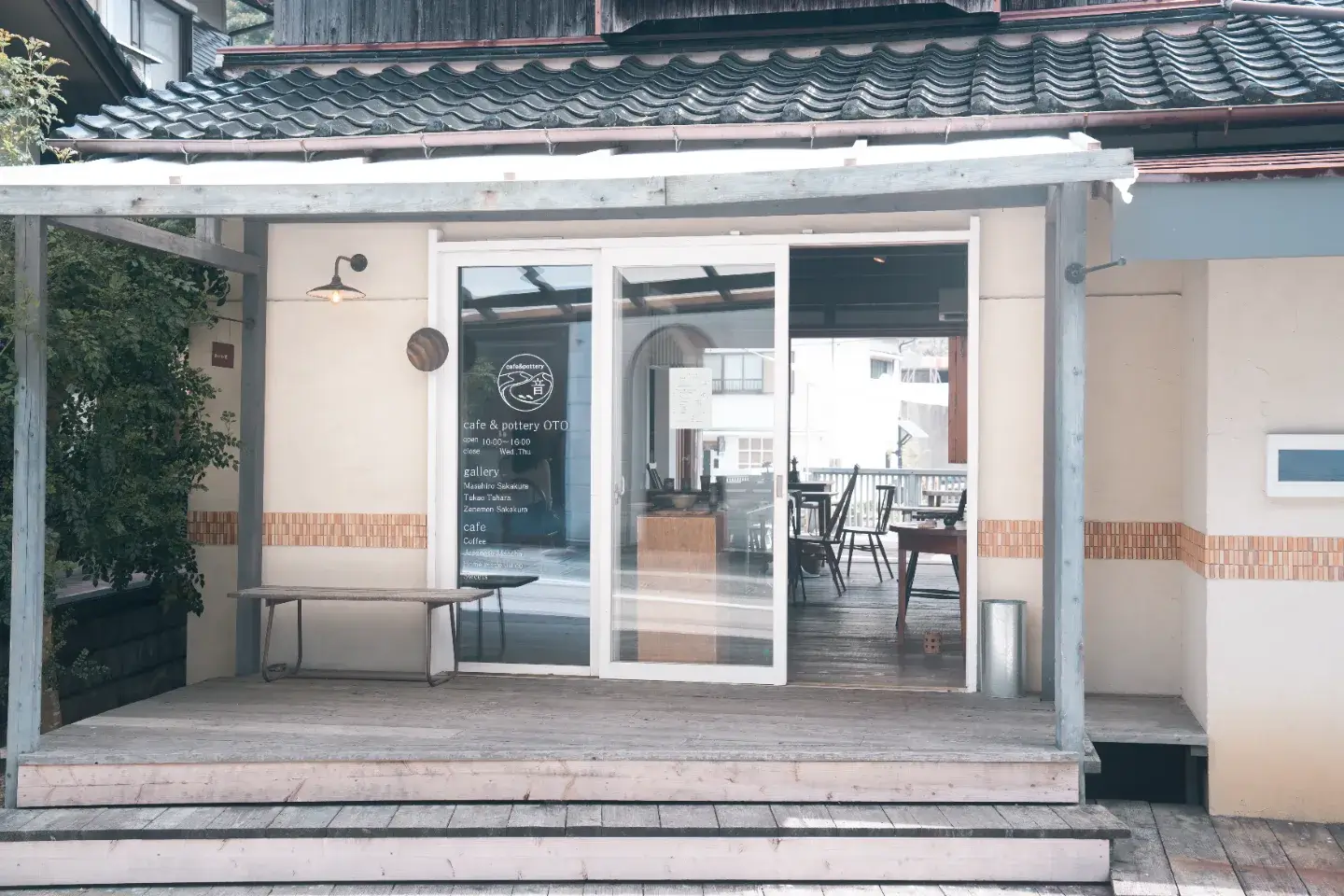 「cafe&pottery音」は、江戸初期より続く地域の伝統産業、萩焼深川窯の器を気軽に楽しめるお店として、温泉街の片隅に2017年夏にオープンしました。手づくりながらシックな色調の店内は、程よく日常から切り離してくれます。