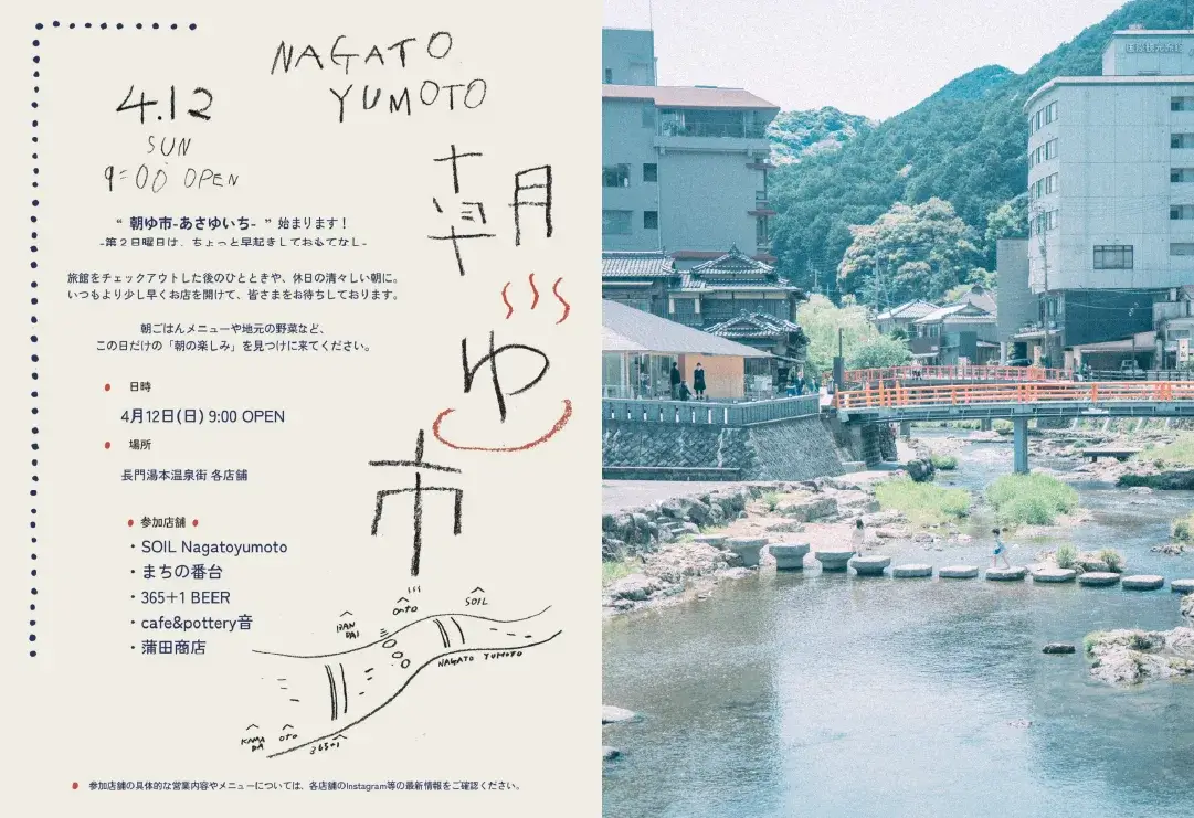 長門湯本REPORT:朝ゆ市レポート。音信川沿いの第二日曜日