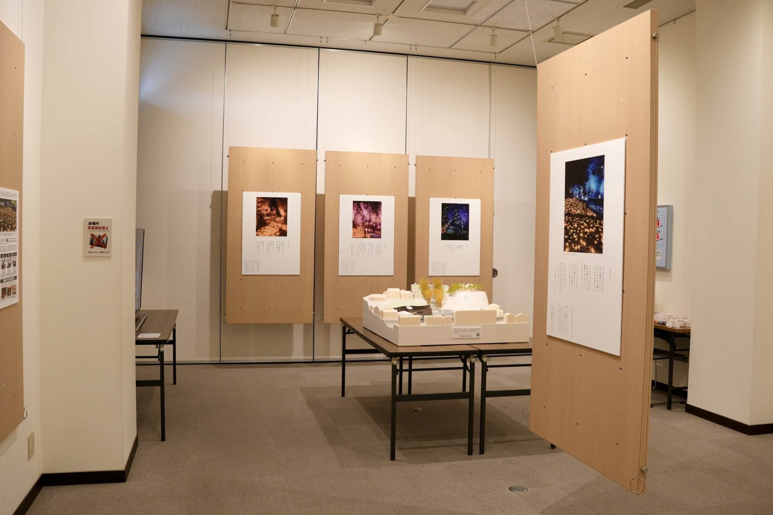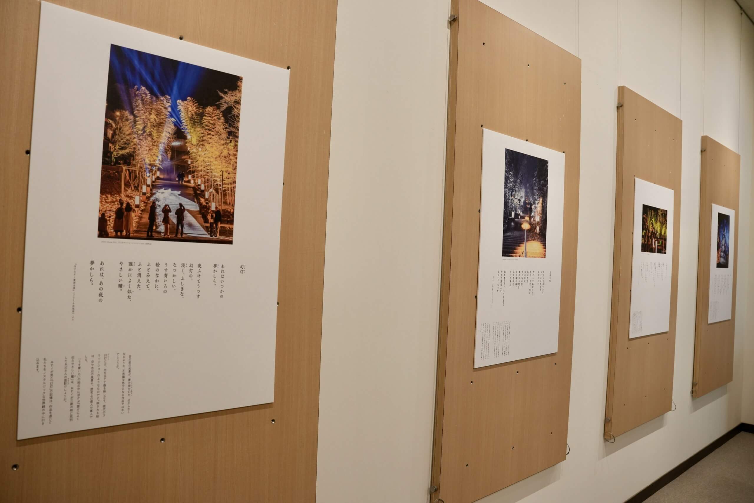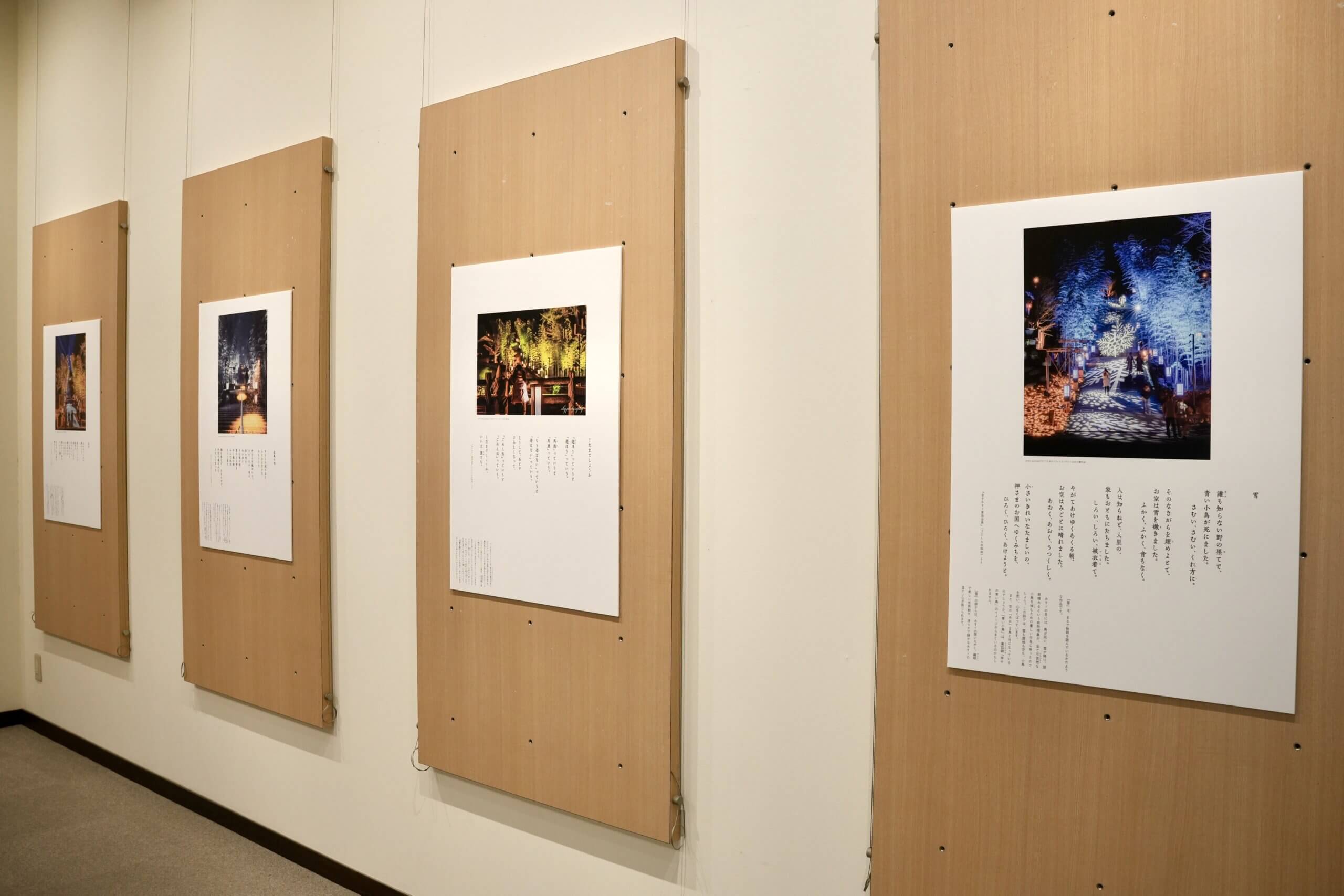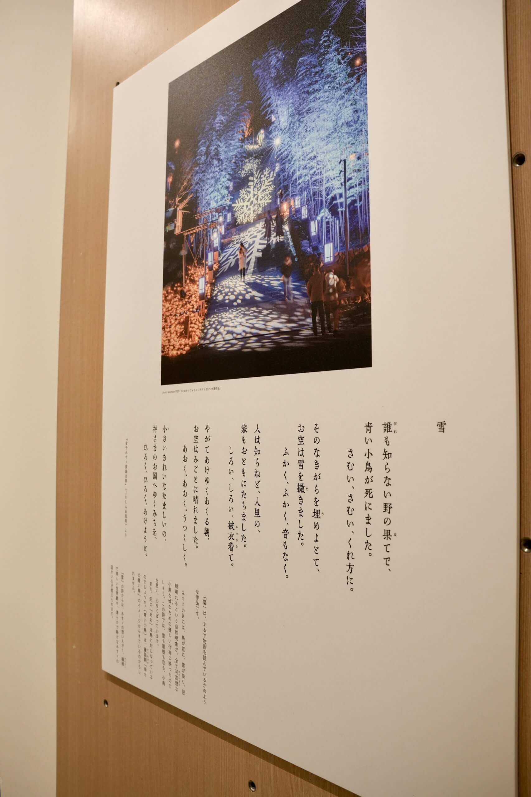 本企画展では、うたあかりの会場で流れる数編の詩を題材に、みすゞさんのまなざしや詩の魅力を、これまでの「うたあかりフォトコンテスト」受賞作品とともに紹介しています。それぞれの詩が記されたパネルには、作品に寄せた詳しい解説が添えられており、一枚の写真と一編の詩が響き合うことで、彼女が何を見つめ、どのような想いで言葉を紡いだのかをより深く感じることができます。