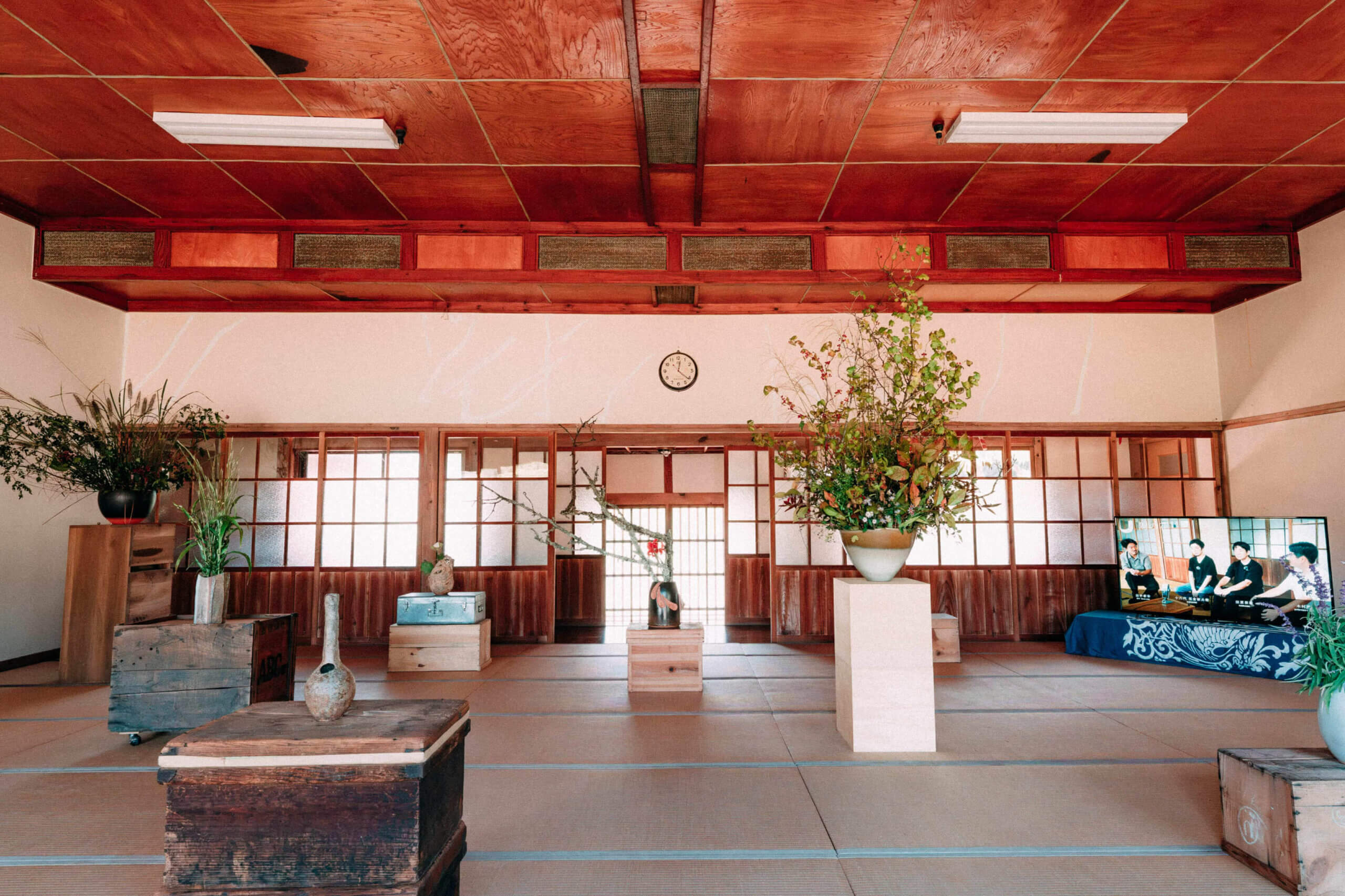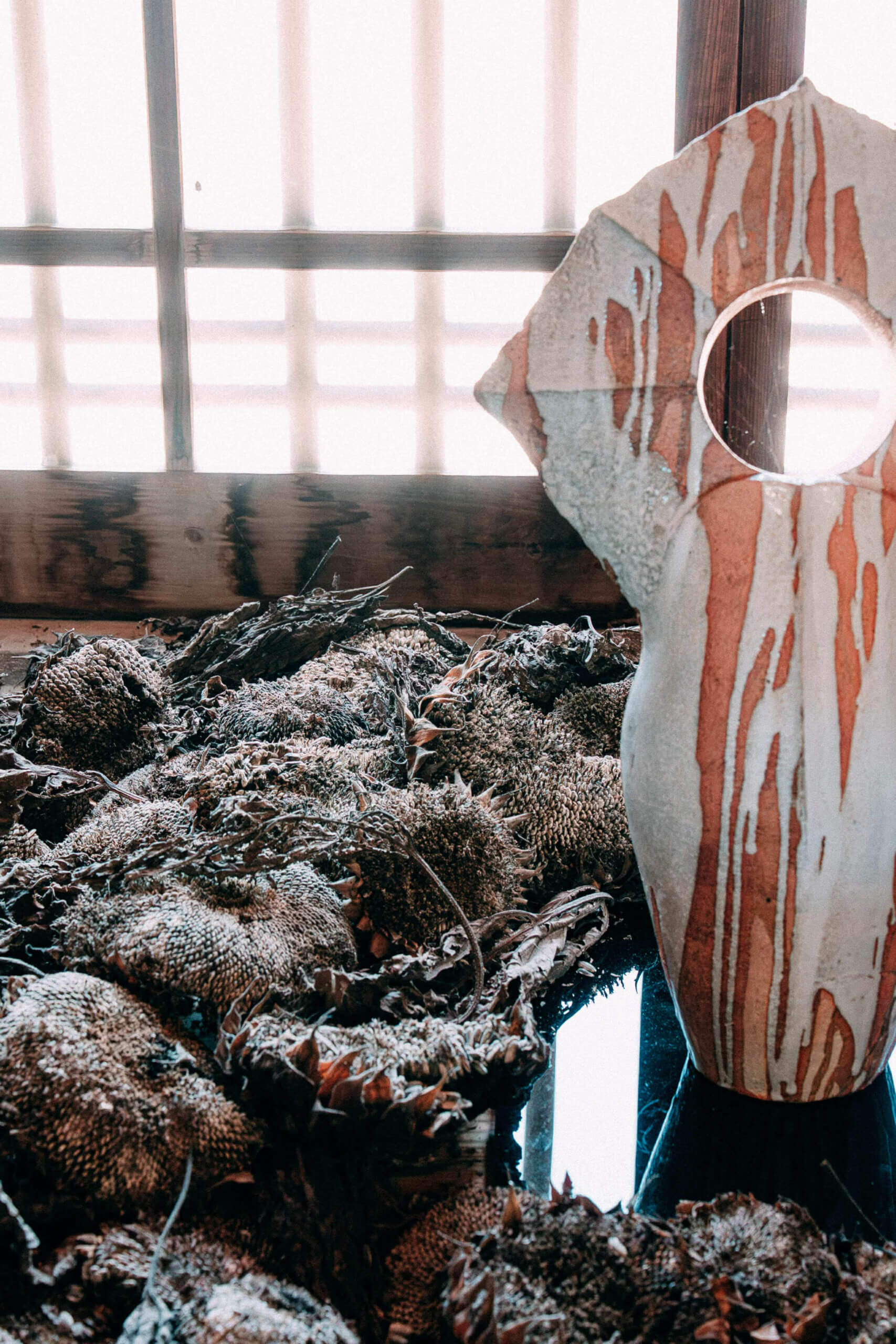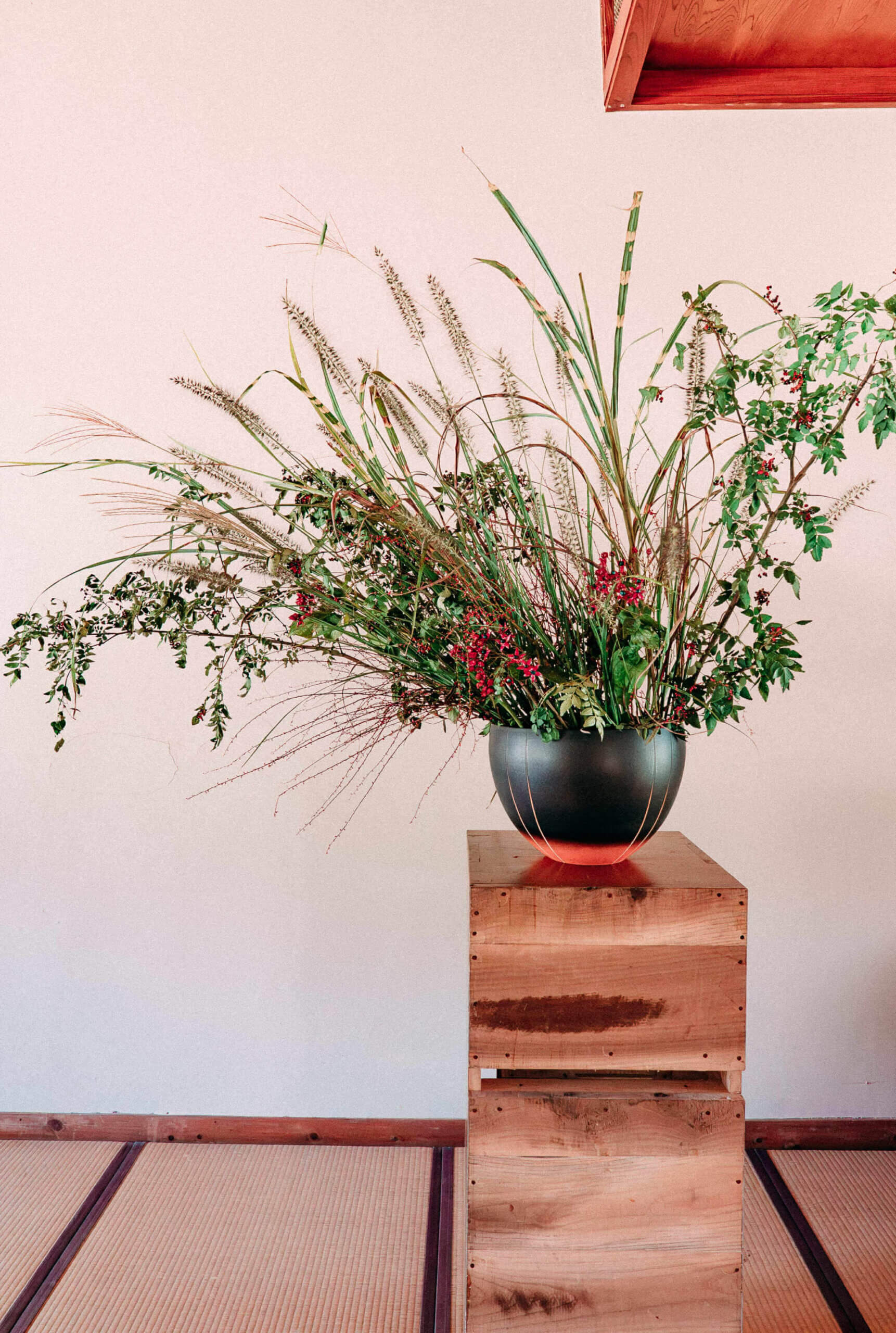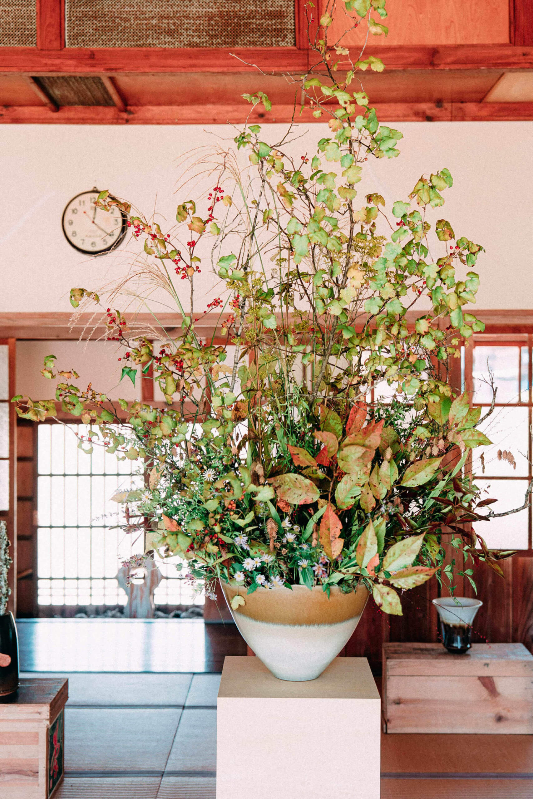 「花は生きものだから、風土に触れずにはいけない」と田中さんは語ります。展示の半年前から三ノ瀬を訪ね、山を歩き、土地の人と語らいながら、そこで育った草木を少しずつ分けてもらいました。展示に使われた植物はすべて地元で採取されたものです。少し枯れかけた葉も、土の匂いも、そのままの姿でいけられました。