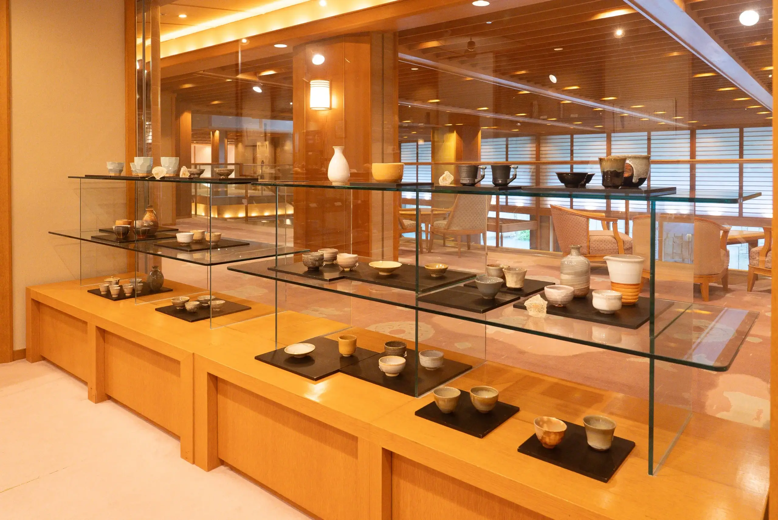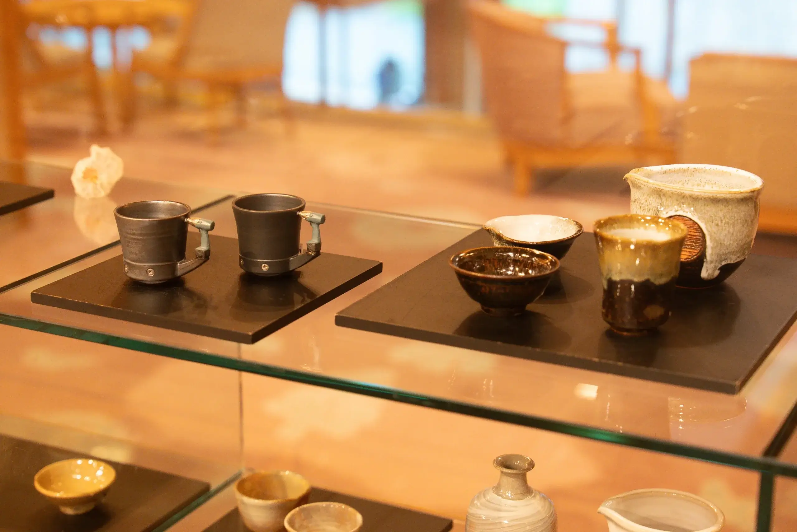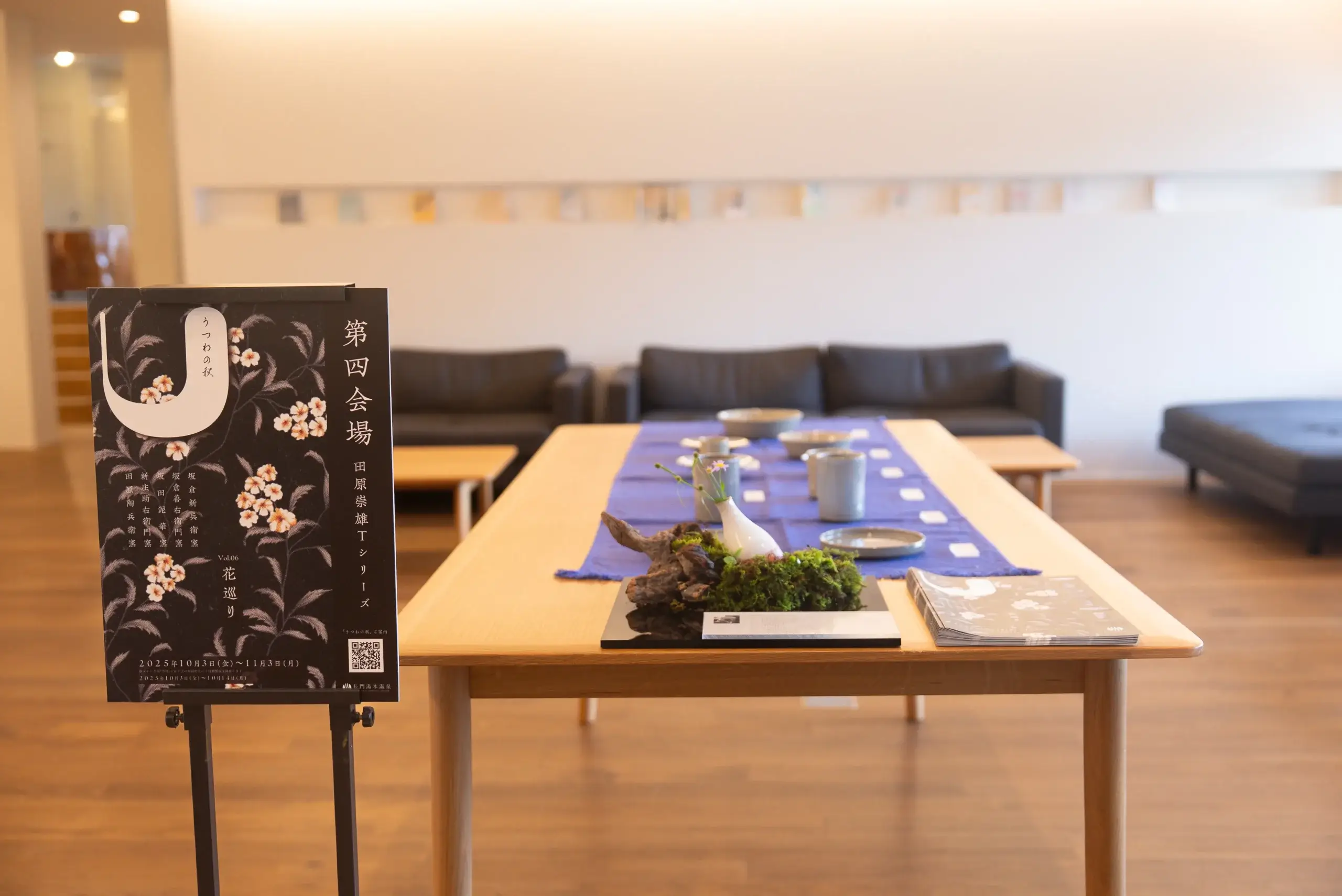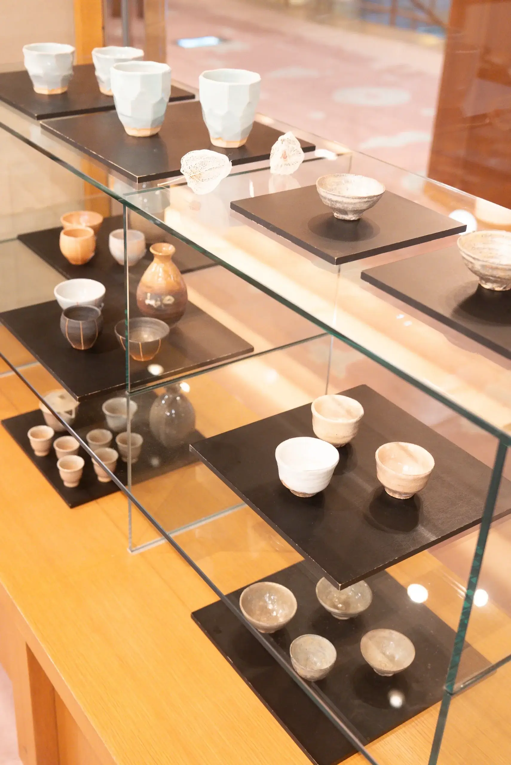 玉仙閣の開放的なロビー空間では、田原崇雄氏によるTシリーズが特別展示されています。日常使いにも最適な、新しいスタイルをご覧いただけます。