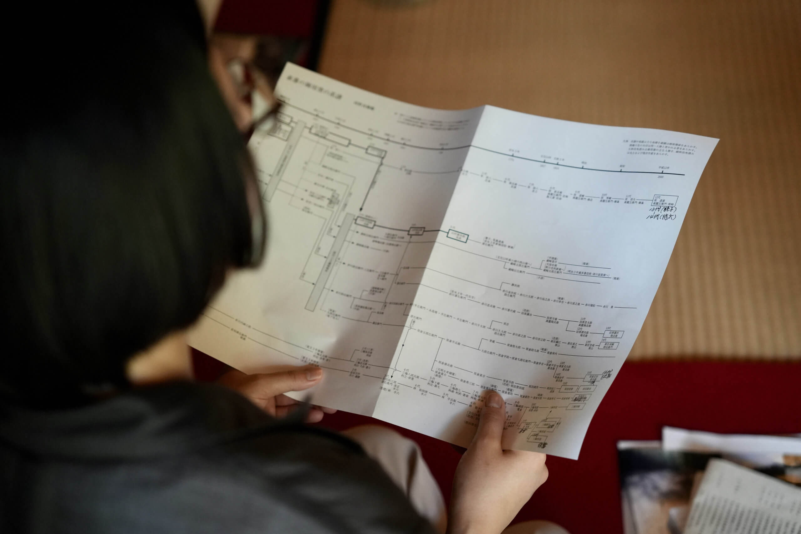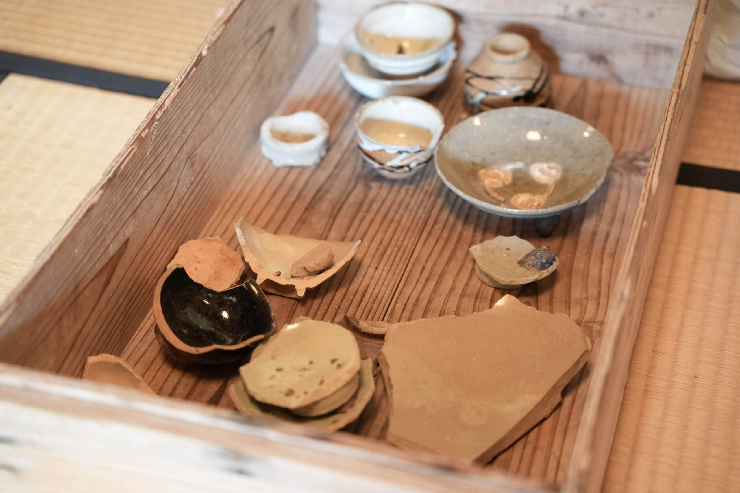最初に訪れたのは新庄助右衛門窯。十四代・新庄貞嗣先生より、資料や古陶片をもとに萩焼の歴史や文化についてご説明いただきました。