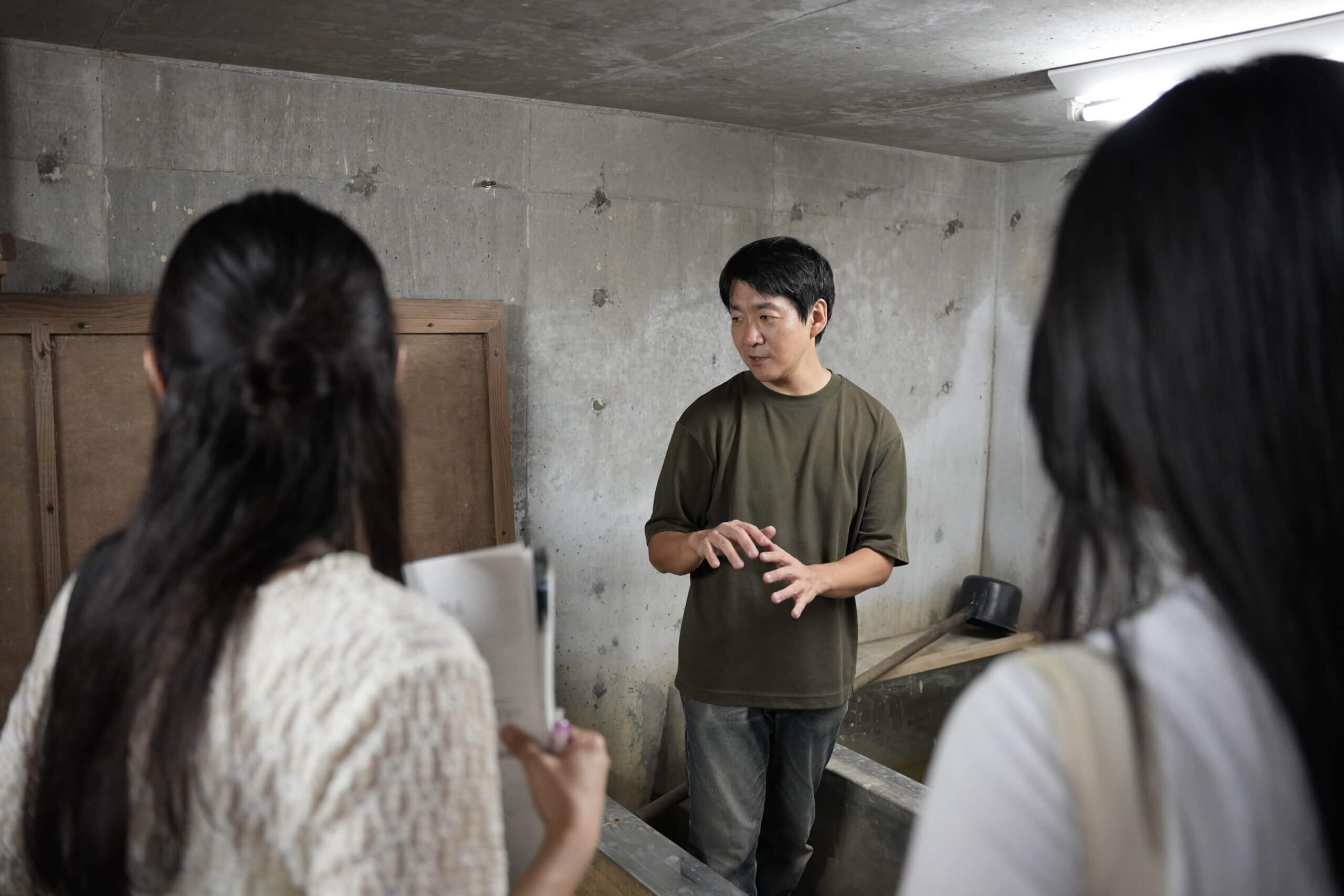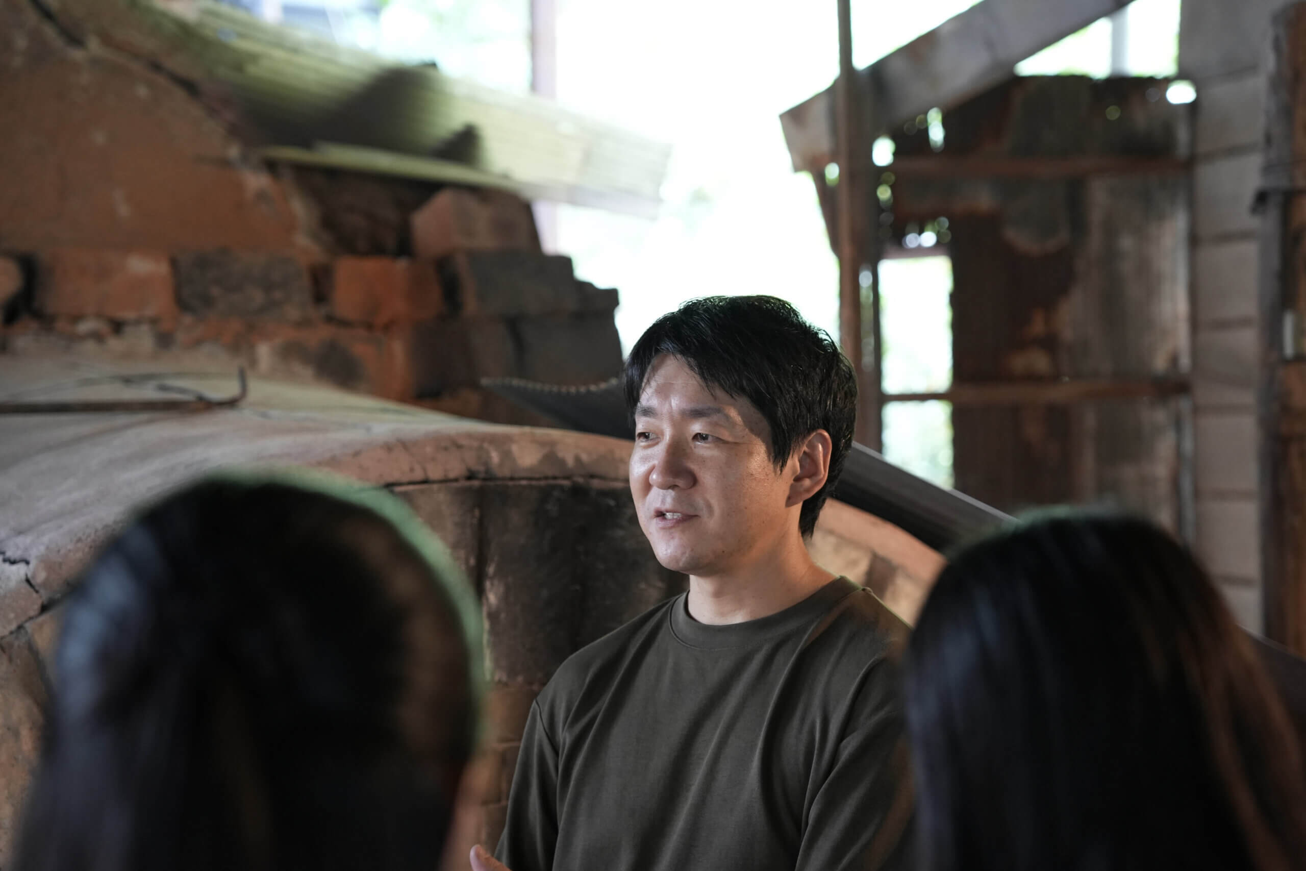 田原崇雄さんの案内でギャラリーや登窯、釉薬の施釉場、土の攪拌・分離の工程など、実際に見せていただきながらさらに深掘り。