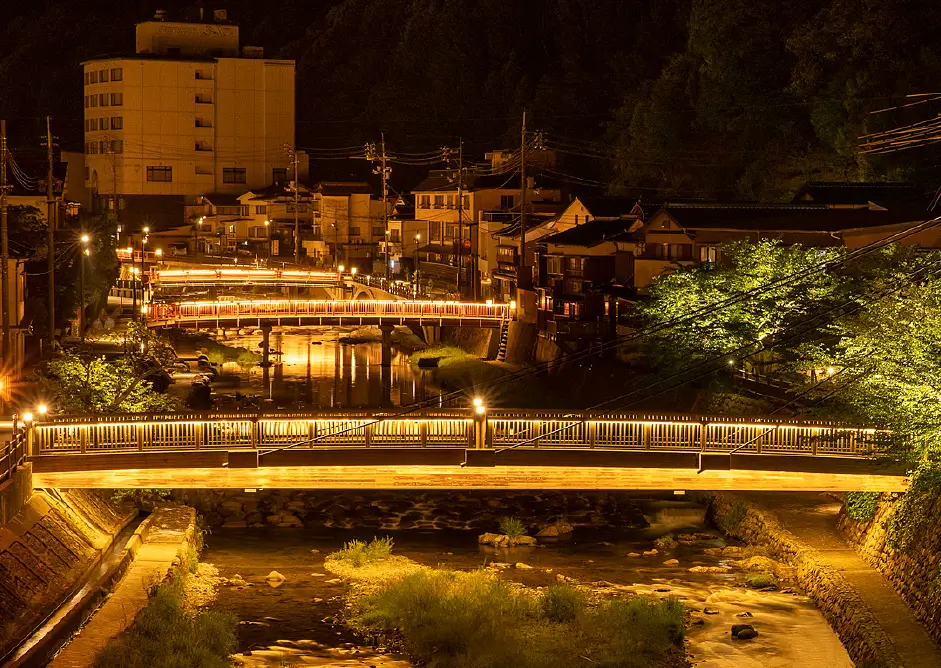 夜のそぞろ歩きにはずせないのが、温泉街のライトアップ。駐車場から音信川につながる竹林の階段や、ゆずきち坂、温泉街の橋が日暮れとともに美しく浮かび上がる姿をご覧ください。