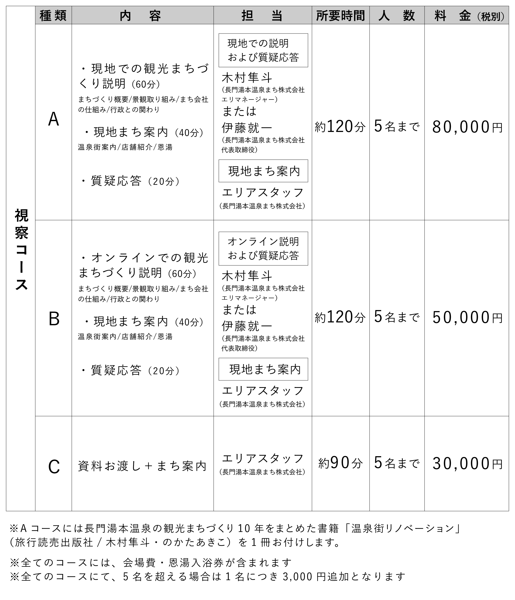 長門湯本温泉では、観光まちづくりに関する視察を幅広く受け付けています。ご希望の方は、視察プランの詳細をご確認の上、ページ下部のフォームよりお申し込みください。※視察対応は原則有料となります。